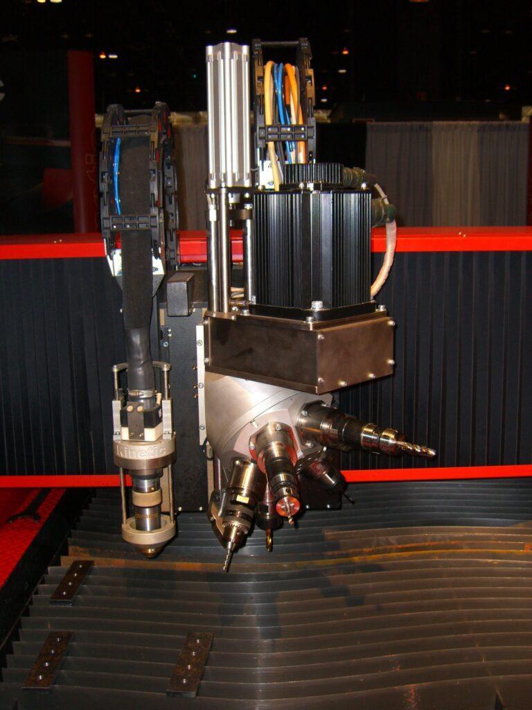 Der Revolverkopf ermöglicht Bohren und Gewindeschneiden mit sechs Werkzeugen sowie den rapiden Werkzeugwechsel. Dieser mit sechs Werkzeugen bestückte Revolverkopf und einer sehr schnellen Werkzeugwechselzeit macht ihn ideal für die Kombination mit Plasmasystemen zur Plattenbearbeitung.